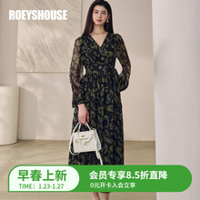 ROEYSHOUSE罗衣贵气感印花雪纺绑带连衣裙女春复古轻奢V领灯笼袖大摆裙13287 花色 S
